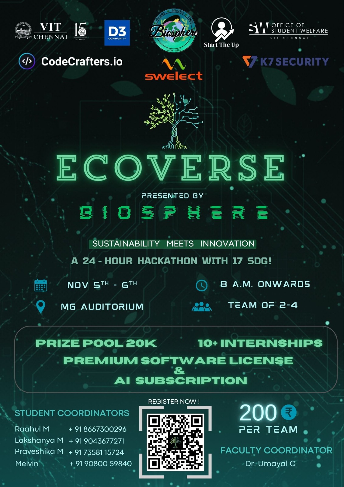 Under the guidance of Dr. Umayal C(Faculty Coordinator), School of Electrical Engineering, the club focuses on respecting, observing and understanding plants, animals, places and culture while getting knowledge and finding new ways to heal the planet.